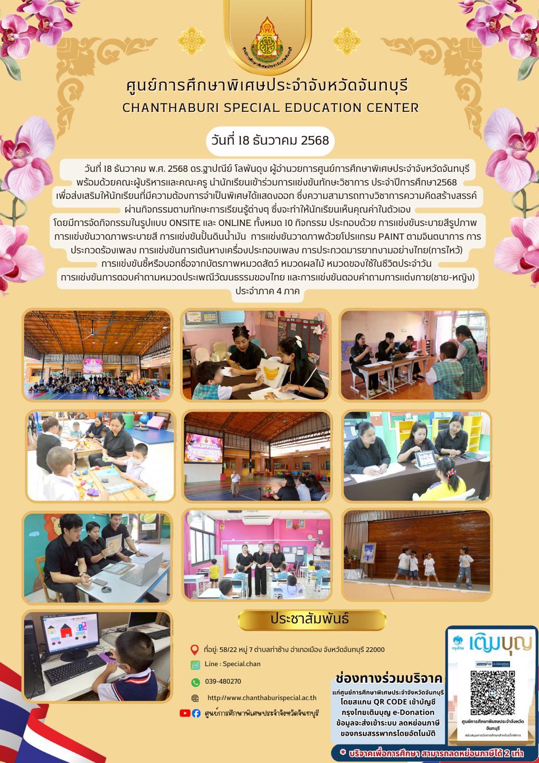 | วันที่ 18 ธันวาคม พ.ศ. 2568 ดร.ฐาปณีย์ โลพันดุง ผู้อำนวยการศูนย์การศึกษาพิเศษประจำจังหวัดจันทบุรี พร้อมด้วยคณะผู้บริหารและคณะครู นำนักเรียนเข้าร่วมการแข่งขันทักษะวิชาการ ประจำปีการศึกษา2568 เพื่อส่งเสริมให้นักเรียนที่มีความต้องการจำเป็นพิเศษได้แสดงออก ซึ่งความสามารถทางวิชาการความคิดสร้างสรรค์ ผ่านกิจกรรมตามทักษะการเรียนรู้ต่างๆ ซึ่งจะทำให้นักเรียนเห็นคุณค่าในตัวเองโดยมีการจัดกิจกรรมในรูปแบบ Onsite และ Online ทั้งหมด 10 กิจกรรม ประกอบด้วย การแข่งขันระบายสีรูปภาพ, การแข่งขันวาดภาพระบายสี,การแข่งขันปั้นดินน้ำมัน, การแข่งขันวาดภาพด้วยโปรแกรม Paint ตามจินตนาการ, การประกวดร้องเพลง, การแข่งขันการเต้นหางเครื่องประกอบเพลง, การประกวดมารยาทงามอย่างไทย(การไหว้), การแข่งขันชี้หรือบอกชื่อจากบัตรภาพหมวดสัตว์ หมวดผลไม้ หมวดของใช้ในชีวิตประจำวัน, การแข่งขันการตอบคำถามหมวดประเพณีวัฒนธรรมของไทย และการแข่งขันตอบคำถามการแต่งกาย (ชาย-หญิง) ประจำภาค 4 ภาค |