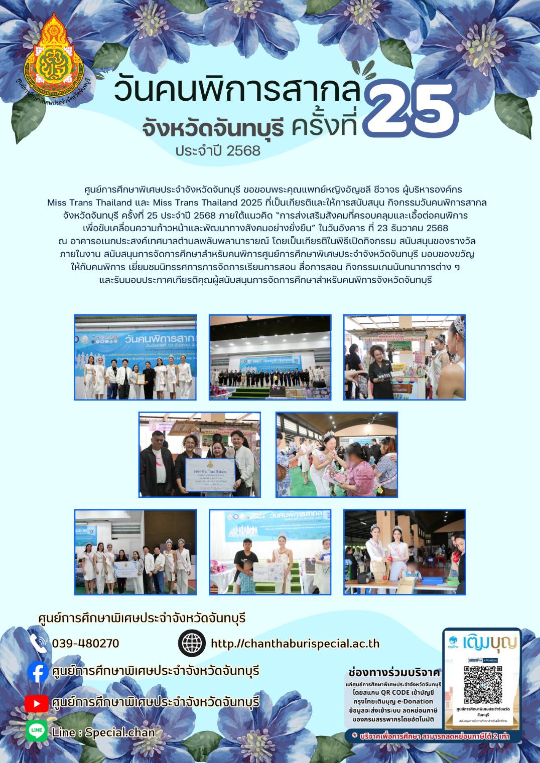 ศูนย์การศึกษาพิเศษประจำจังหวัดจันทบุรี ขอขอบพระคุณแพทย์หญิงอัญชลี ชีวาจร ผู้บริหารองค์กร Miss Trans Thailand และ Miss Trans Thailand 2025 ที่เป็นเกียรติและให้การสนับสนุน กิจกรรมวันคนพิการสากลจังหวัดจันทบุรี ครั้งที่ 25 ประจำปี 2568 ภายใต้แนวคิด “การส่งเสริมสังคมที่ครอบคลุมและเอื้อต่อคนพิการ เพื่อขับเคลื่อนความก้าวหน้าและพัฒนาทางสังคมอย่างยั่งยืน” ในวันอังคาร ที่ 23 ธันวาคม 2568 ณ อาคารอเนกประสงค์เทศบาลตำบลพลับพลานารายณ์ โดยเป็นเกียรติในพิธีเปิดกิจกรรม สนับสนุนของรางวัลภายในงาน สนับสนุนการจัดการศึกษาสําหรับคนพิการศูนย์การศึกษาพิเศษประจำจังหวัดจันทบุรี มอบของขวัญ