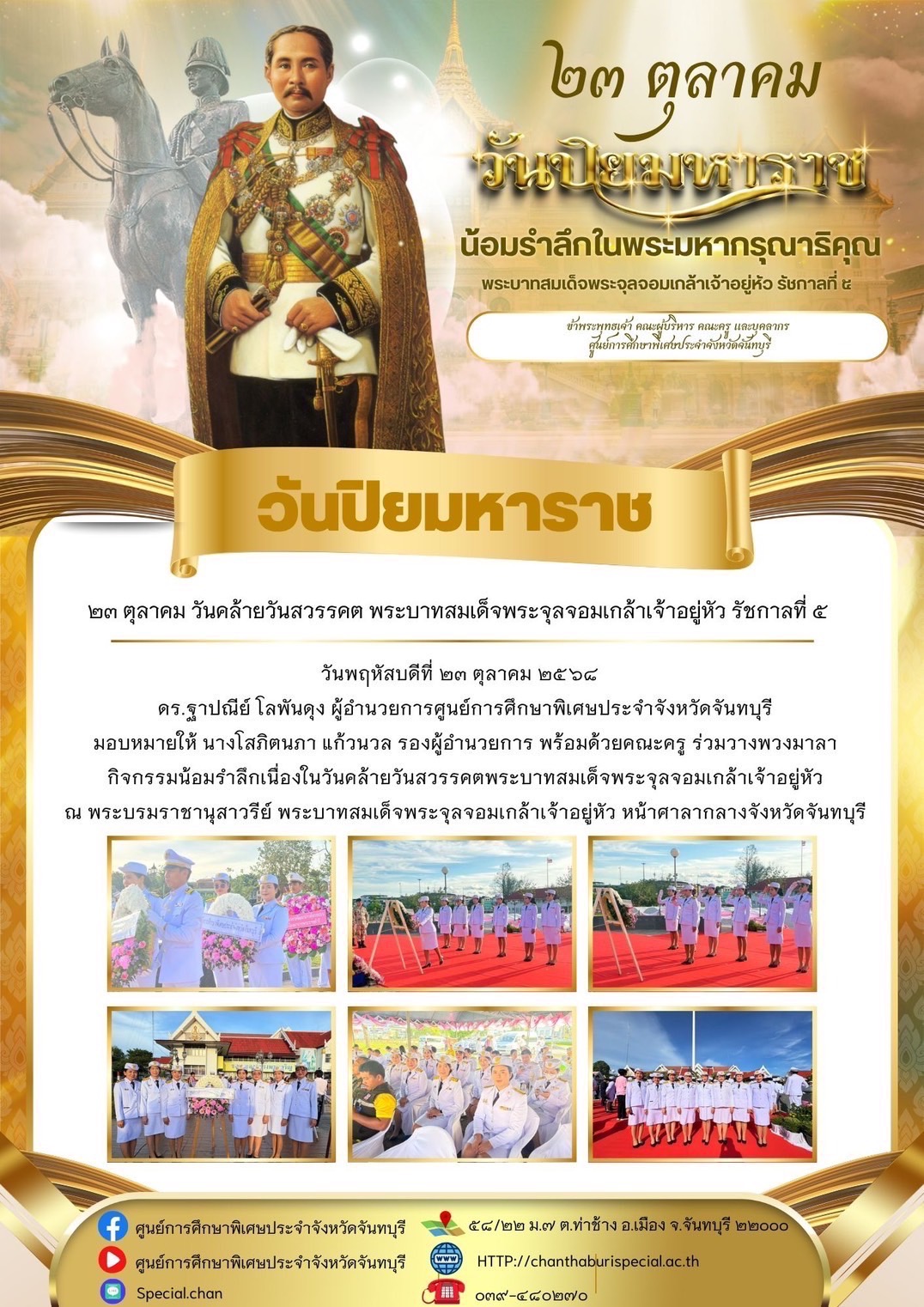 วันพฤหัสบดีที่ 23 ตุลาคม 2568 ดร.ฐาปณีย์ โลพันดุง ผู้อำนวยการศูนย์การศึกษาพิเศษประจำจังหวัดจันทบุรี มอบหมายให้ นางโสภิตนภา แก้วนวล รองผู้อำนวยการ พร้อมด้วยคณะครู ร่วมวางพวงมาลา กิจกรรมน้อมรำลึกเนื่องในวันคล้ายวันสวรรคตพระบาทสมเด็จพระจุลจอมเกล้าเจ้าอยู่หัว ณ พระบรมราชานุสาวรีย์ พระบาทสมเด็จพระจุลจอมเกล้าเจ้าอยู่หัว หน้าศาลากลางจังหวัดจันทบุรี