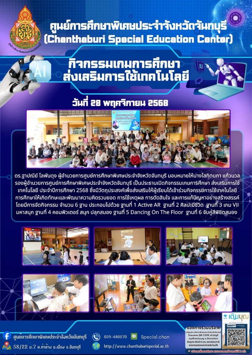 | วันที่ 28 พฤศจิกายน 2568 ดร.ฐาปณีย์ โลพันดุง ผู้อำนวยการศูนย์การศึกษาพิเศษประจำจังหวัดจันทบุรี มอบหมายให้นางโสภิตนภา แก้วนวล รองผู้อำนวยการศูนย์การศึกษาพิเศษประจำจังหวัดจันทบุรี เป็นประธานเปิดกิจกรรมเกมการศึกษา ส่งเสริมการใช้เทคโนโลยี ประจำปีการศึกษา 2568 ซึ่งมีวัตถุประสงค์เพื่อส่งเสริมให้ผู้เรียนได้เข้าร่วมกิจกรรมการใช้เทคโนโลยีการศึกษาให้เกิดทักษะและพัฒนาความคิดรวบยอด การใช้เหตุผล การตัดสินใจ และการแก้ปัญหาอย่างสร้างสรรค์ โดยมีการจัดกิจกรรม จำนวน 6 ฐาน ประกอบไปด้วย ฐานที่ 1 Active AR ฐานที่ 2 ศิลปะมีชีวิต ฐานที่ 3 เกม VII มหาสนุก ฐานที่ 4 คอมพิวเตอร์ สนุก ปลุกสมอง ฐานที่ 5 Dancing On The Floor ฐานที่ 6 จับคู่สีพิชิตสมอง |